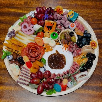 Why let the kids get all the treats on Halloween! The Char-boo-terie board is filled with 3 charcuterie meats, 4 cheeses, fruits, nuts and fun treats! It is 13" and will feed 8-10 people as an appetizer.